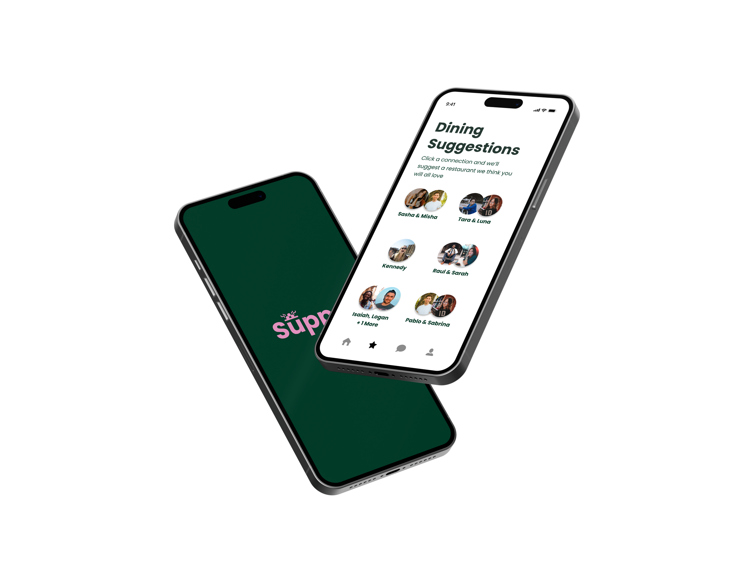 Supper aims to increase a user’s social network through dining experiences. The application creates a framework for how their users are to take their connection from the digital realm to the physical one. Supper cultivates friendships through individual and group connection, while providing users with suggestions on nearby restaurants to connect in person.